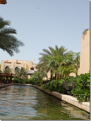 Een van die swembaddens langs die kaneel met ‘n nuwe 5-ster hotel van JW Mariott wat voor die moskee gebou word op die agtergrond.